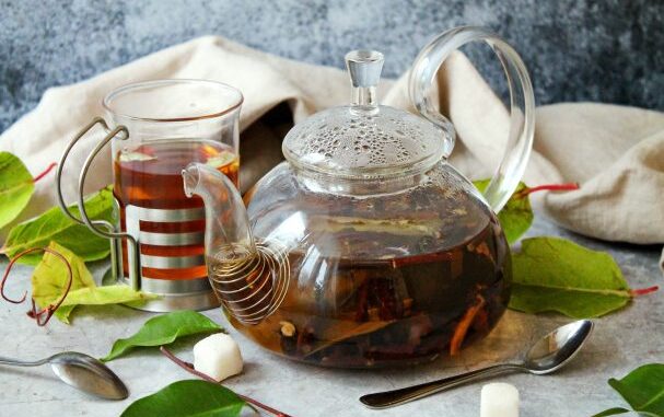 Добавьте в чайник черный чай, залейте все кипятком, закройте и настаивайте в течение 10 минут.