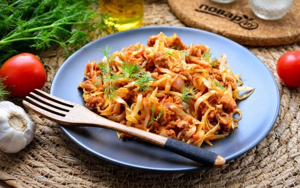 Сперва обжаривайте мясной фарш на сковороде с овощами и специями, а затем добавьте нарезанную капусту и тушите все до готовности. Подавайте как основное блюдо в горячем виде к столу или в качестве закуски в холодном виде.