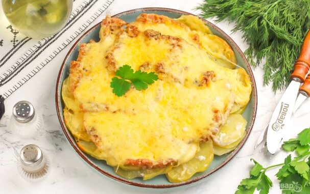 Аккуратно смажьте картофельный слой сметаной любой жирности или майонезом. Можно просто сбрызнуть растительным маслом. Запеките картофель 10 минут при температуре 180 градусов. Помните, что нарезка не должна быть слишком толстой.