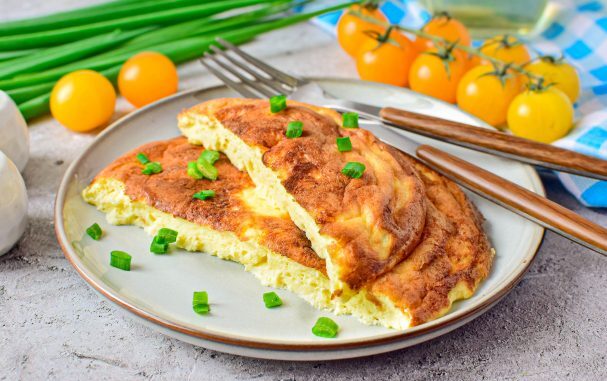 Переложите омлет на тарелку и подавайте к столу. Посыпьте измельченным зеленым луком.