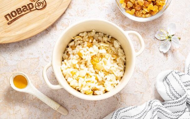 Переложите рис в креманку или горшочек для запекания. Добавьте промытый изюм.