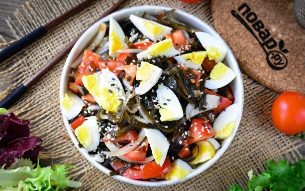 Назначение: На обед / На ужин Основной ингредиент: Рыба и морепродукты / Овощи / Морепродукты / Помидор / Морская капуста Блюдо: Салаты