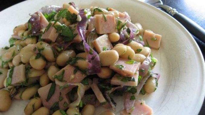 Смешайте в супнице 1 — 1 * стакана хорошо высушенных вареных бобов, 1 луковицу, нарезанную тонкой соломкой, 100 г мелко нарезанной ветчины или отварного мяса (из супа), 1-2 порезанных кубиками яйца вкрутую, соль и перец пробовать.