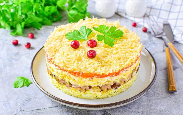 Последним слоем выложите тертый сыр и аккуратно снимите сервировочное кольцо. Готовый салат немного охладите перед подачей и украсьте на свой вкус.