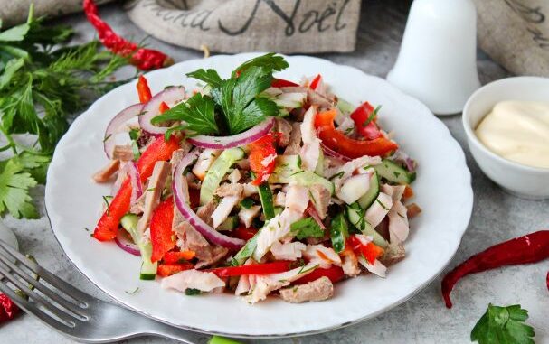 Салат с языком и курицей готов. Приятного аппетита!