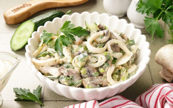 Салат с кальмаром, огурцом и грибами готов. Подавайте сразу же. Приятного аппетита!