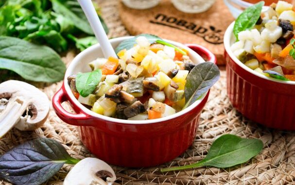 Недорогие и доступные продукты для такого салата делают блюдо практичным для каждой хозяйки. Картофель и морковь удобно сварить заранее, останется лишь нарезать соленые огурцы, обжарить грибы с луком и все перемешать с маслом!