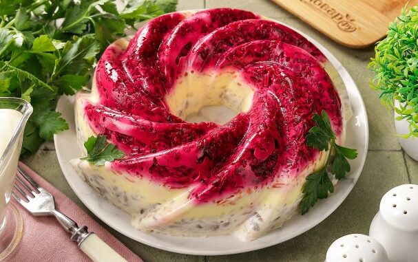 Поставьте салат в холодильник на 2 часа, можно убрать на ночь. Форму с застывшим салатом переверните на тарелку и украсьте по желанию зеленью. Селёдочная шуба с желатином готова.