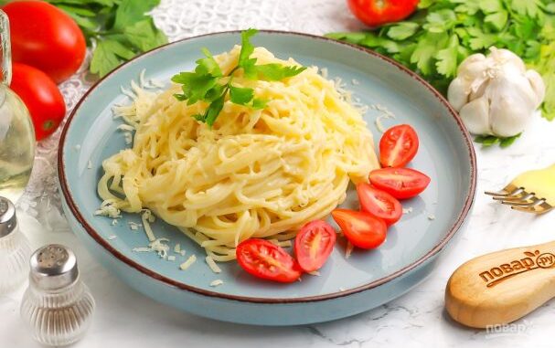 Спагетти выбирайте по своему вкусу — они бывают трех размеров: тонкие, средние и толстые. Соответственно это номер: 1,3,5 — номера указаны на пачке спагетти. Быстрее всего отвариваются тонкие и требуют меньше жидкости. В рецепте используется номер 3 — поэтому рассчитывайте объем жидкости исходя из толщины пасты. Сыр можно добавить как твердый, так и мягкий рассольный. Главное — при этом почувствовать норму соли, чтобы не пересолить блюдо. Подавайте спагетти к столу горячими, чтобы сыр тянулся при дегустации.